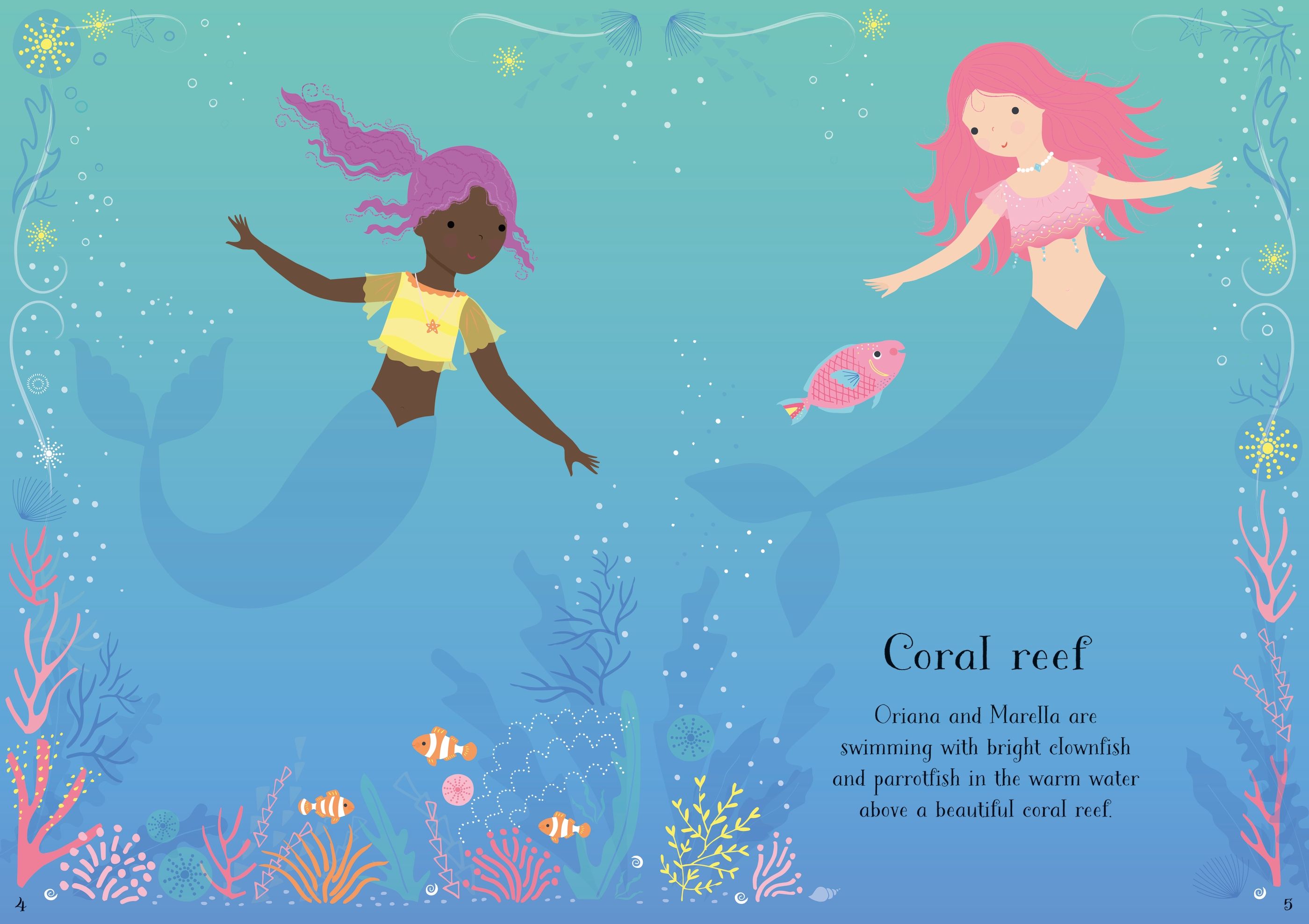 An enchanting little sticker book full of mermaids for young children to dress. With over 200 stickers of sparkly mermaid tails, friendly sea creatures, shell jewellery and seaweed skirts to add as the mermaids swim in a coral reef, ride seahorses, find treasure and more. The back cover folds out for parking spare stickers when not in use.