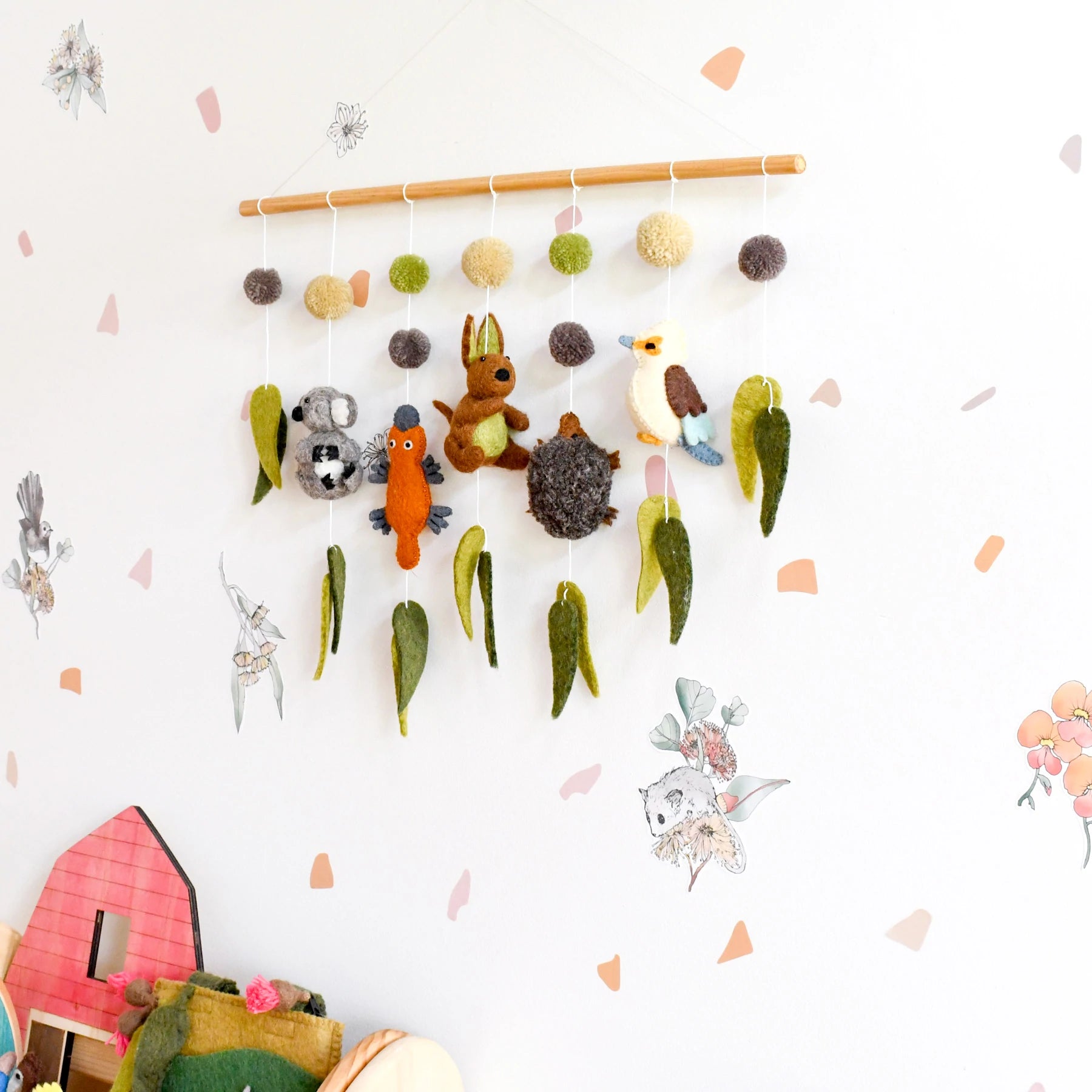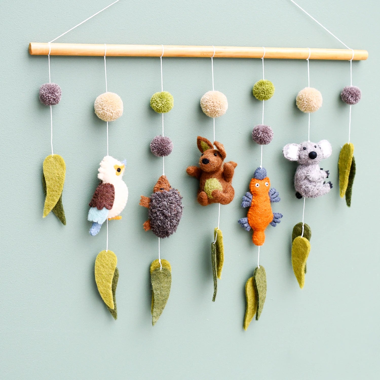 Enjoy Australia's most popular animals in a hanging, a beautiful dreamy Australian piece for your baby's nursery. Each hanging features a Koala, Platypus, Kangaroo, Echidna, Kookaburra, Eucalyptus leaves and Pompoms. It is the perfect handmade gift for an Australian-themed nursery.