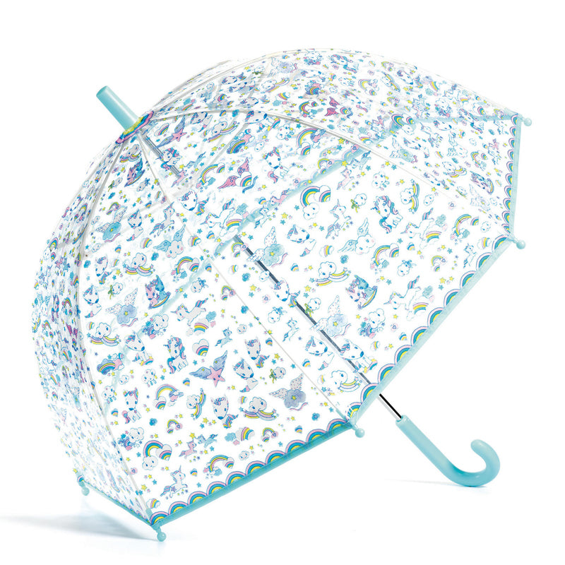 A magical unicorn themed child's umbrella that is sure to brighten a rainy day. Transparent PVC allows a child to see where they are going and the high dome provides better coverage.