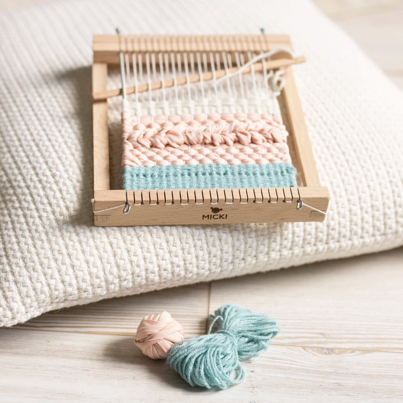 Are you creative? Weave some fine rugs for your doll’s house or little cloths for mummy and daddy with this classic wooden weaving frame from Micki. This weaving frame is threaded and ready to go, and it comes with 10 metres of extra warp so that you can re-thread it easily. It also comes with two different yarns in modern colours – a soft, thick yarn and a Bouclé yarn, 5 metres each.