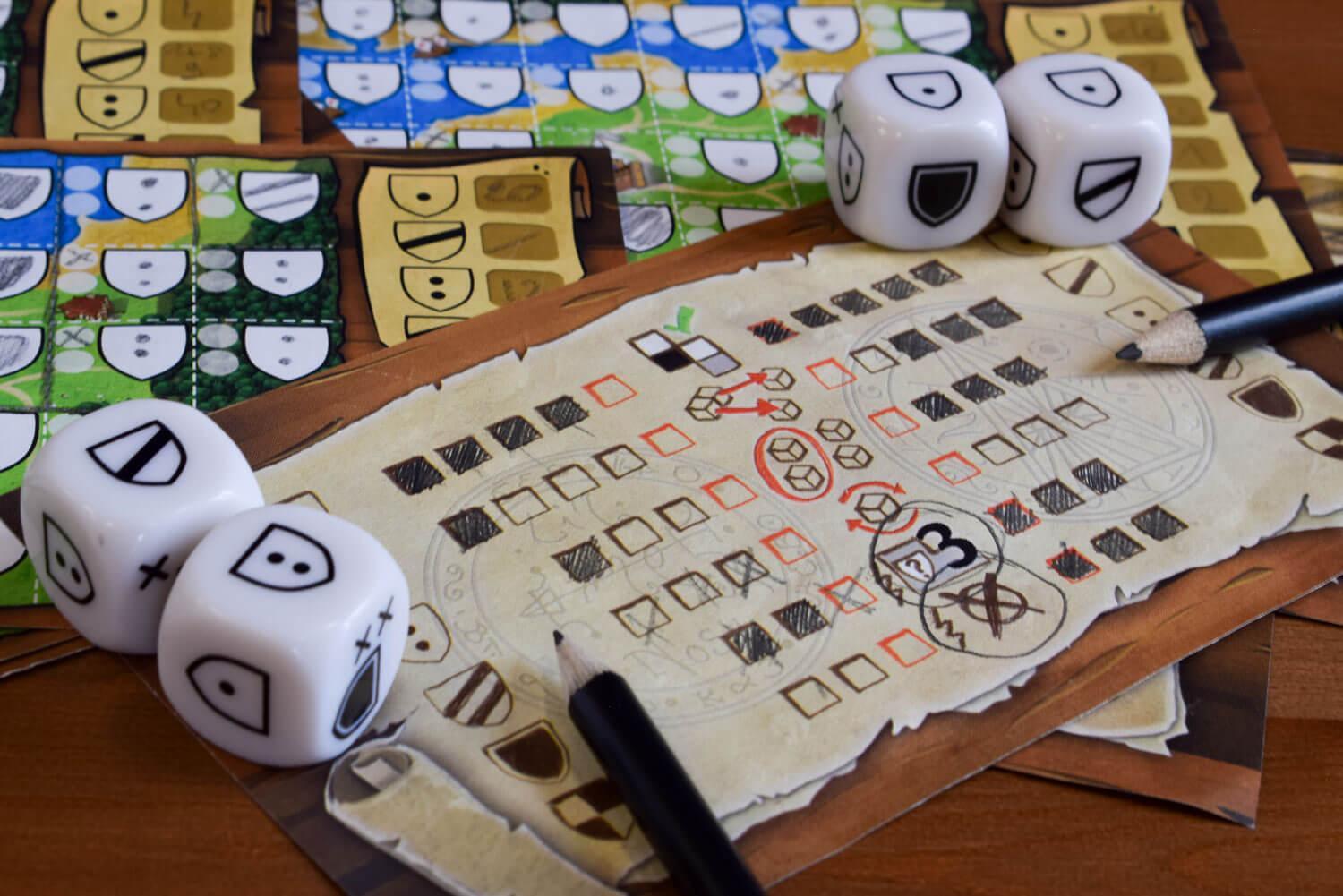 Roll the dice, combine them in a domino and watch your kingdom row! Kingdomino Duel is a dice game in which players will constitute a domino at their turn by combining 2 dice and drawing it onto their map. At each turn, player 1 will select the one die, player 2 will select the second and third die and finally player 1 will take the remaining die. The territories will score points in the same way as in the original game. Players can also gather magical powers from the wizard in order to cast spells.