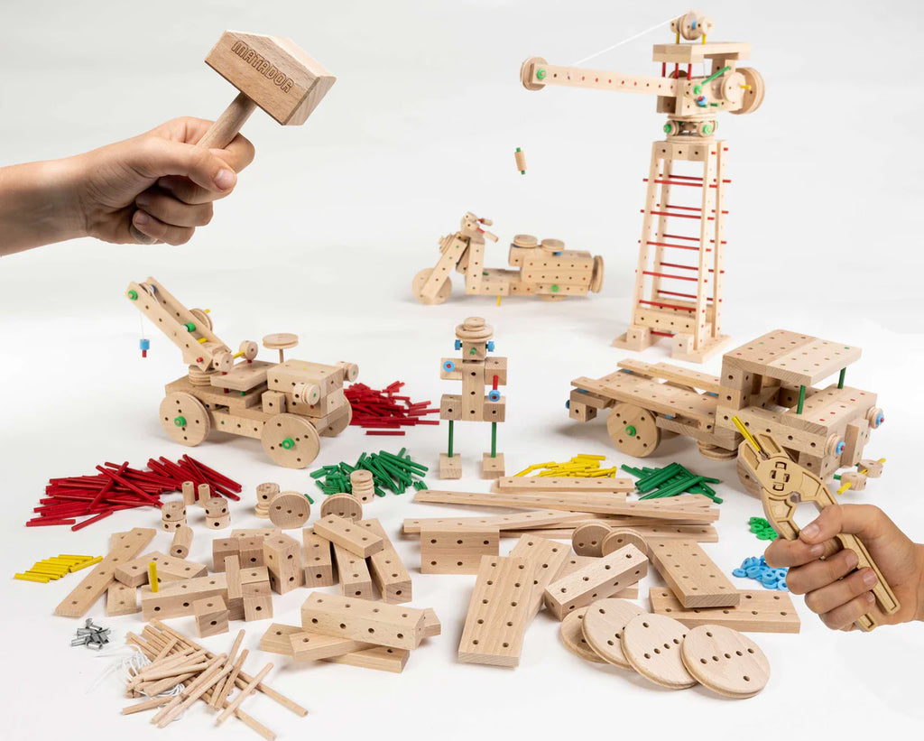 MATADOR Explorer wood construction sets are unique worldwide in allowing children to develop and implement their imagination and ideas. Thanks to the wood’s singular accuracy of fit, these sets fulfil the requirement for both simple and complex models. Blocks drilled to precision, perfectly fitting linking pins, axles and wheels – a variety of construction options which have fascinated young and old for generations. Using the Matador hammer, not only simple models such as airplanes, cars, figurines, but also more complicated and technically advanced and entire Matador landscapes can be built.