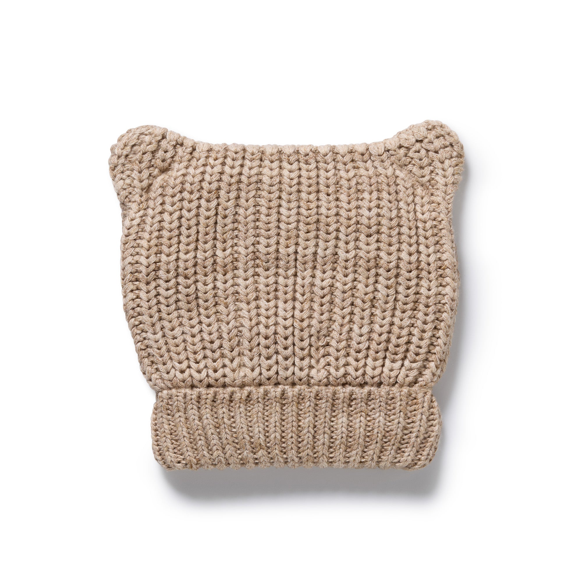 Made from organic cotton, bamboo, and wool, it features a soft turn up ribbed cuff for added warmth and comfort. A playful addition to any winter outfit.