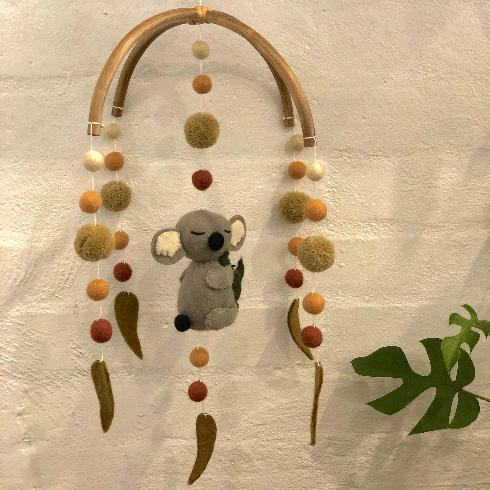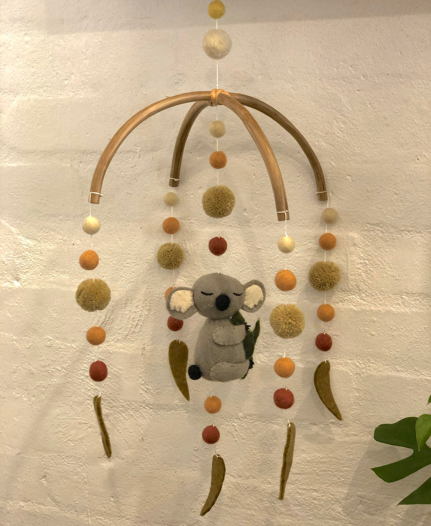 The frame of this Koala mobile is made from bent bamboo and tied together with rattan. These sustainable materials are lightweight and strong. Ethically hand-felted from 100% New Zealand wool. Coloured with azo-free dye, safe for children and pets.