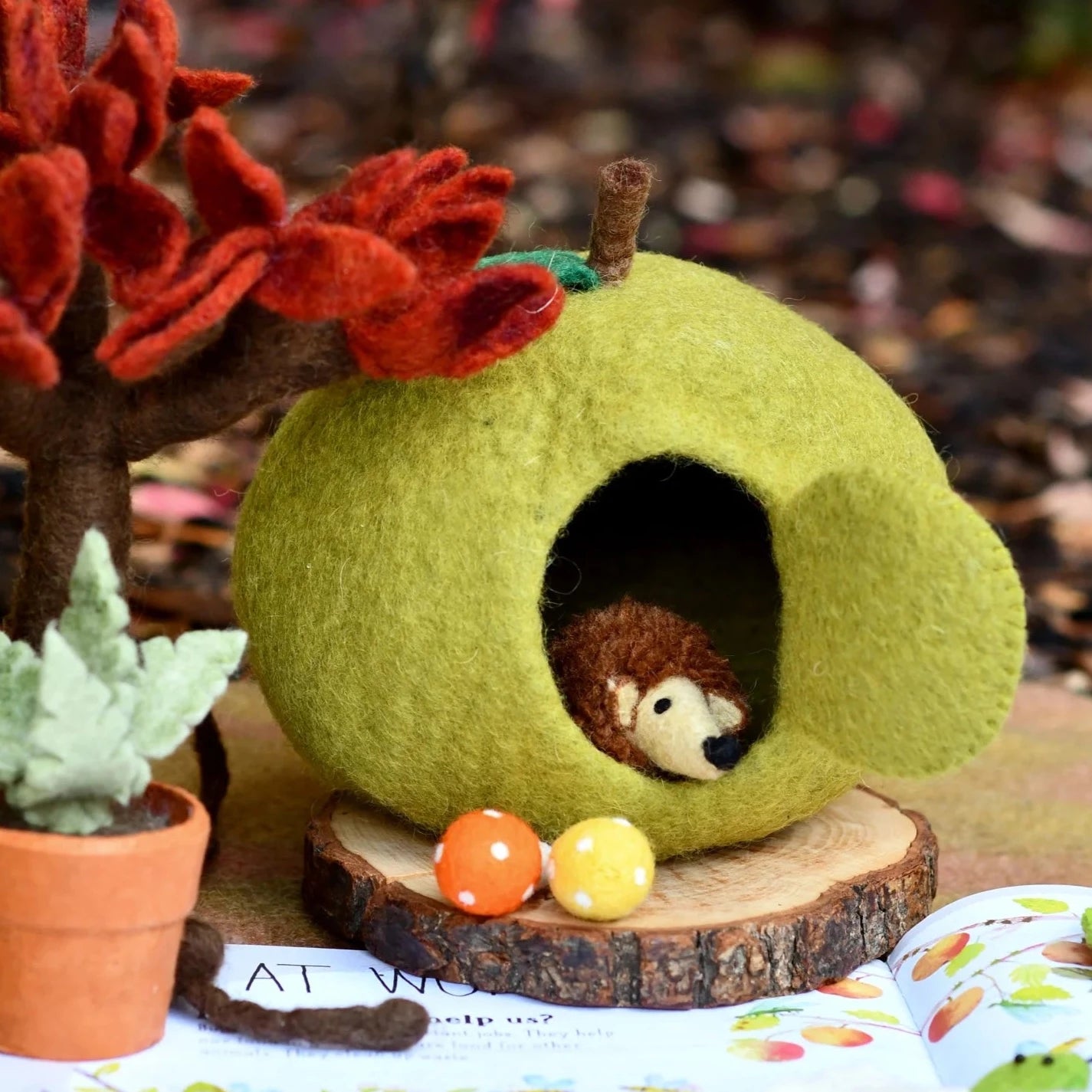 Our green apple house comes with a small hedgehog toy. All other felt items in the pictures are to illustrate usage and sold separately.