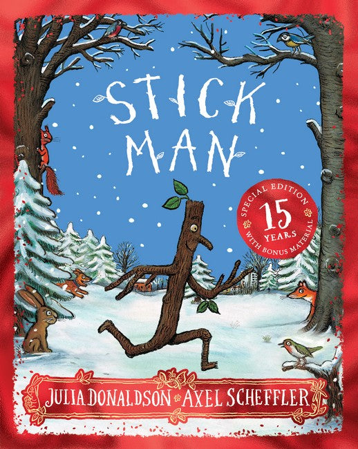 A fabulous foiled edition celebrating the fifteenth anniversary of the publication of Stick Man by Julia Donaldson and Axel Scheffler with exclusive material from the author and illustrator. Learn how Julia Donaldson came up with the idea for the story, and see how Axel Scheffler perfected Stick Man. Stick Man lives in the family tree With his Stick Lady Love and their stick children three. But it's dangerous being a Stick Man. A dog wants to play with him, a swan builds her nest with him. He even ends up on a fire! Will he ever get back to the family tree?