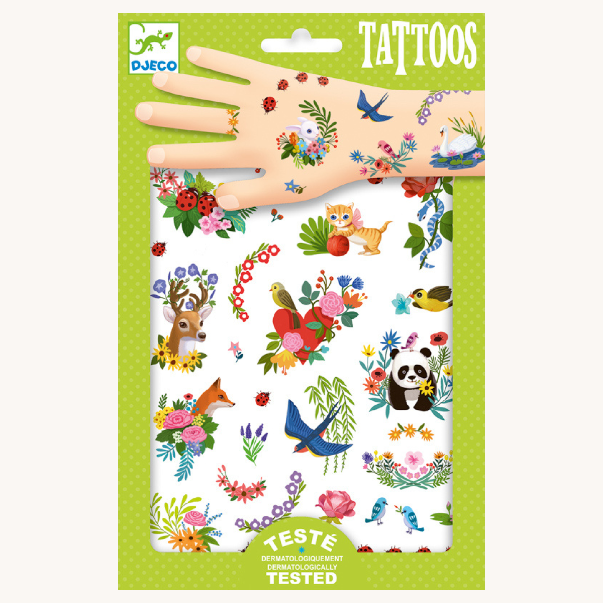 Pretty Spring themed tattoos with sweet flowers and quaint animals. Two sheets per pack - perfect for sharing with friends.Dermatologically tested.
