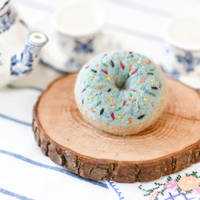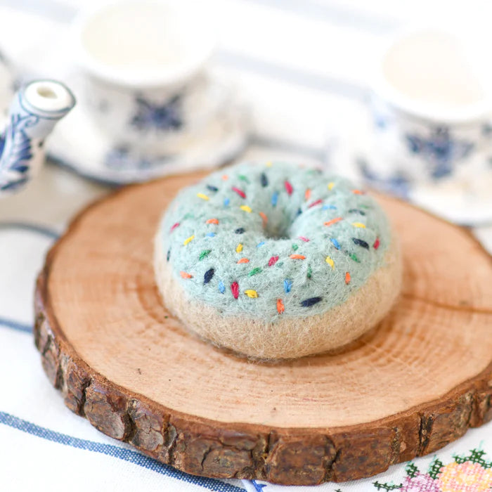 This listing is for 1 felt blue frosted doughnut. Each doughnut has been meticulously needle- felted with dense wool that has been dyed with non-toxic colours, making it safe for play.