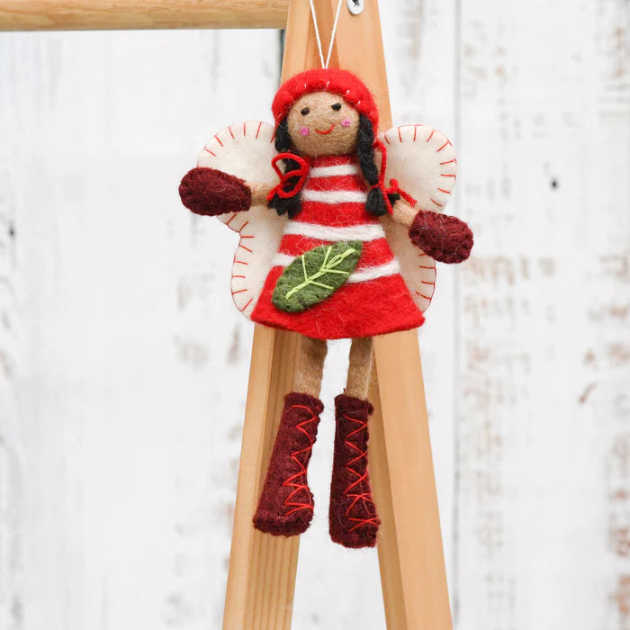 Build an enchanting playroom or add some magic to your Christmas tree with these popular felt fairy hangings. This listing is for a felt Greetings fairy hanging in a red dress and white wings