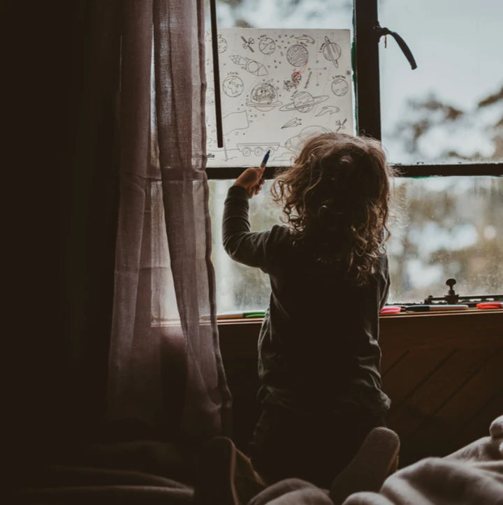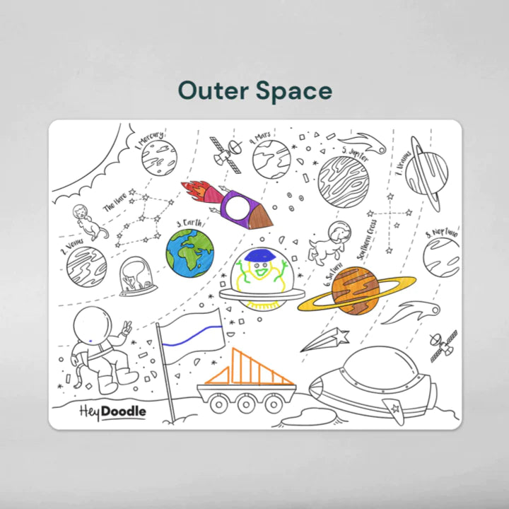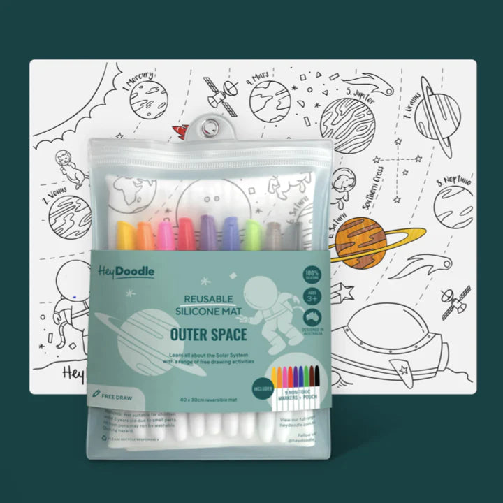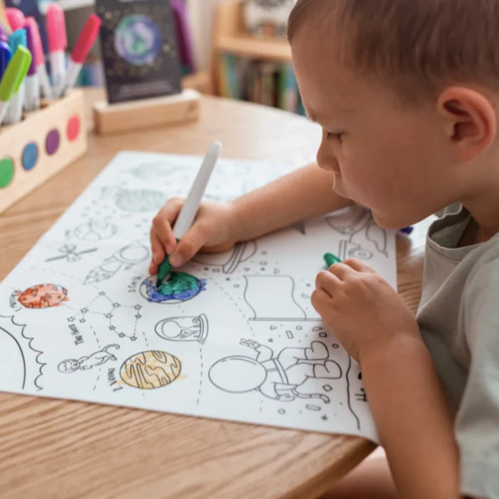 Each mat is thoughtfully designed and features an educational theme (ie space, letters, farm animals, numbers) so your curious kids can learn as they trace, draw and colour!