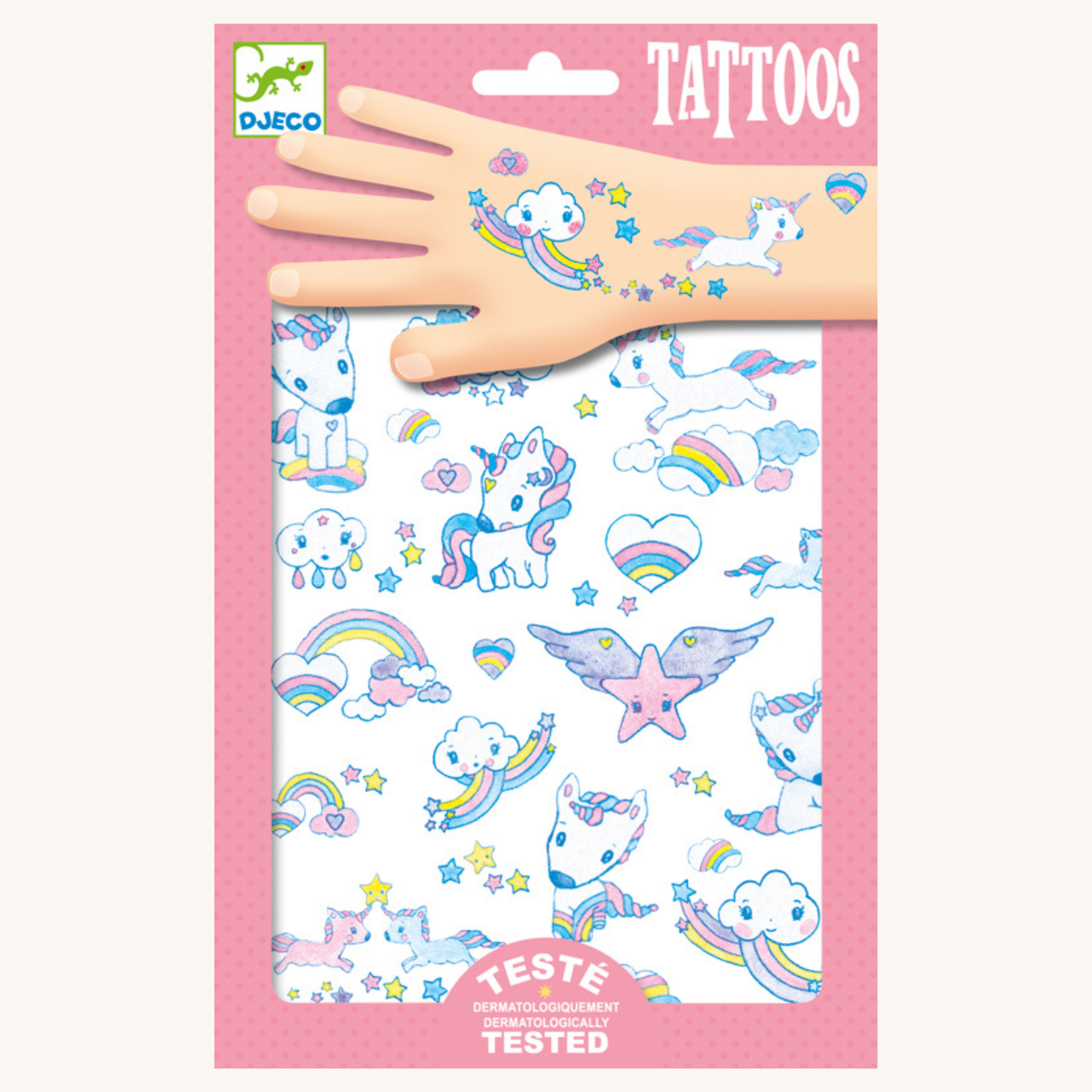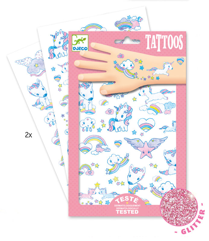 Set of two dermatologically tested tattoos. Unicorn theme features glitter.