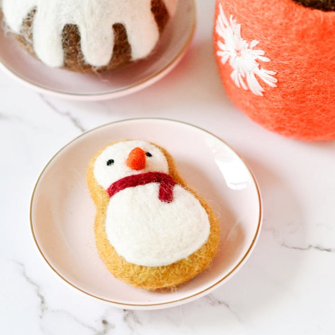 This listing is for 1 gingerbread snowman cookie. Each cookie has been meticulously needle-felted with dense wool that has been dyed with non-toxic colours, making it safe for play.
