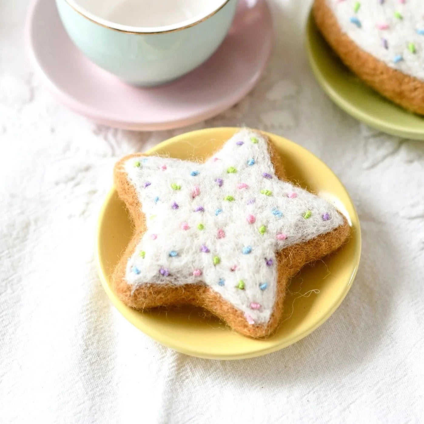 Felt icing cookies in star shape are a sweet addition to any pretend play shop. These cute and playful decorations add a touch of whimsy and romance to any space, and are perfect for any pretend playtime.