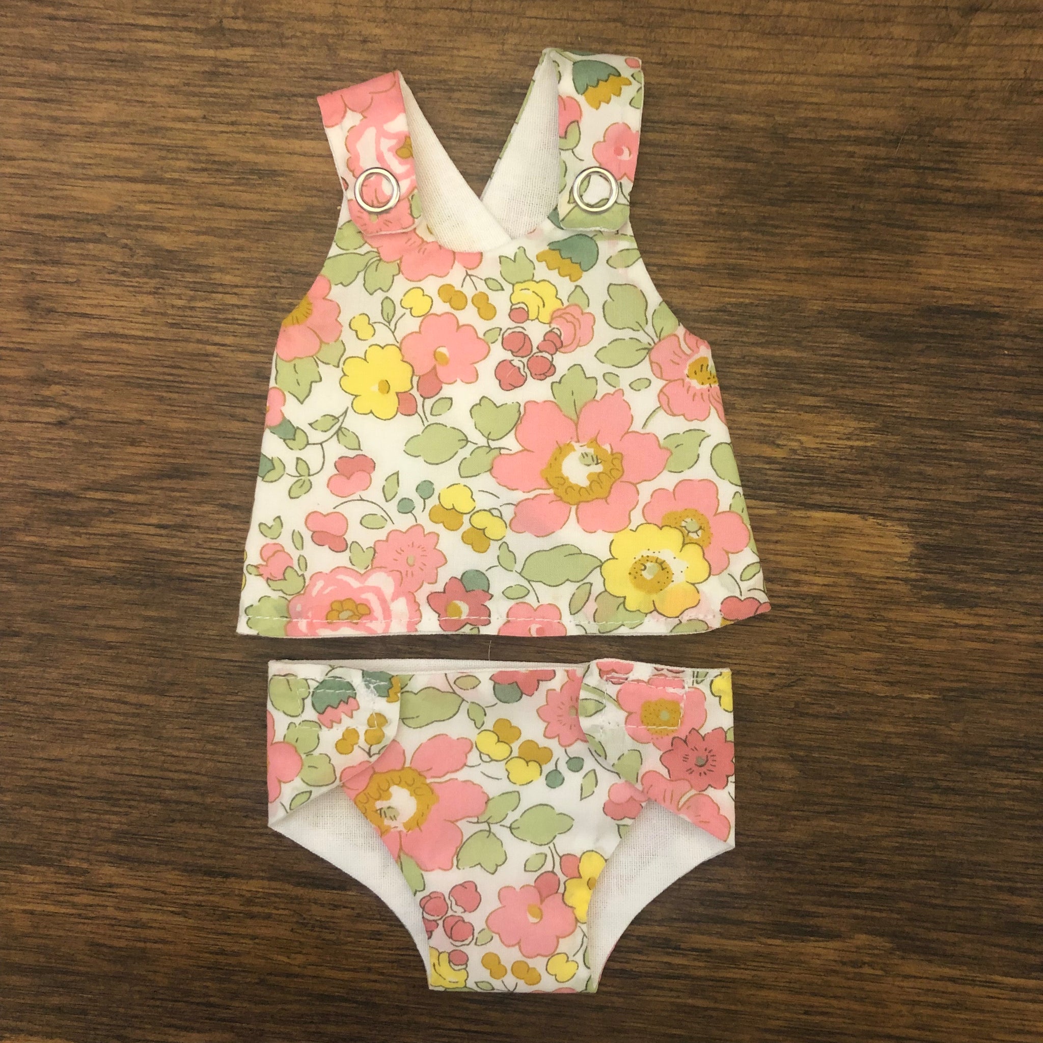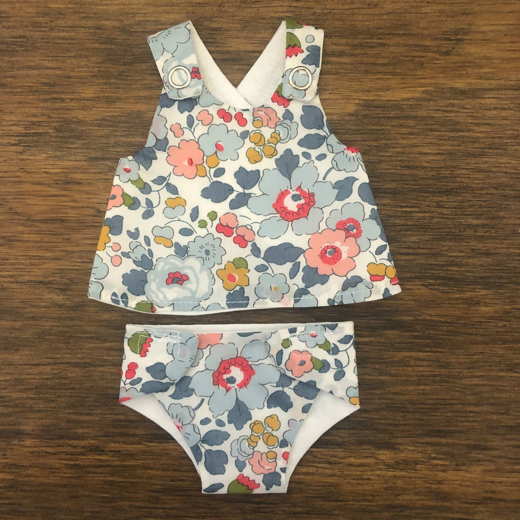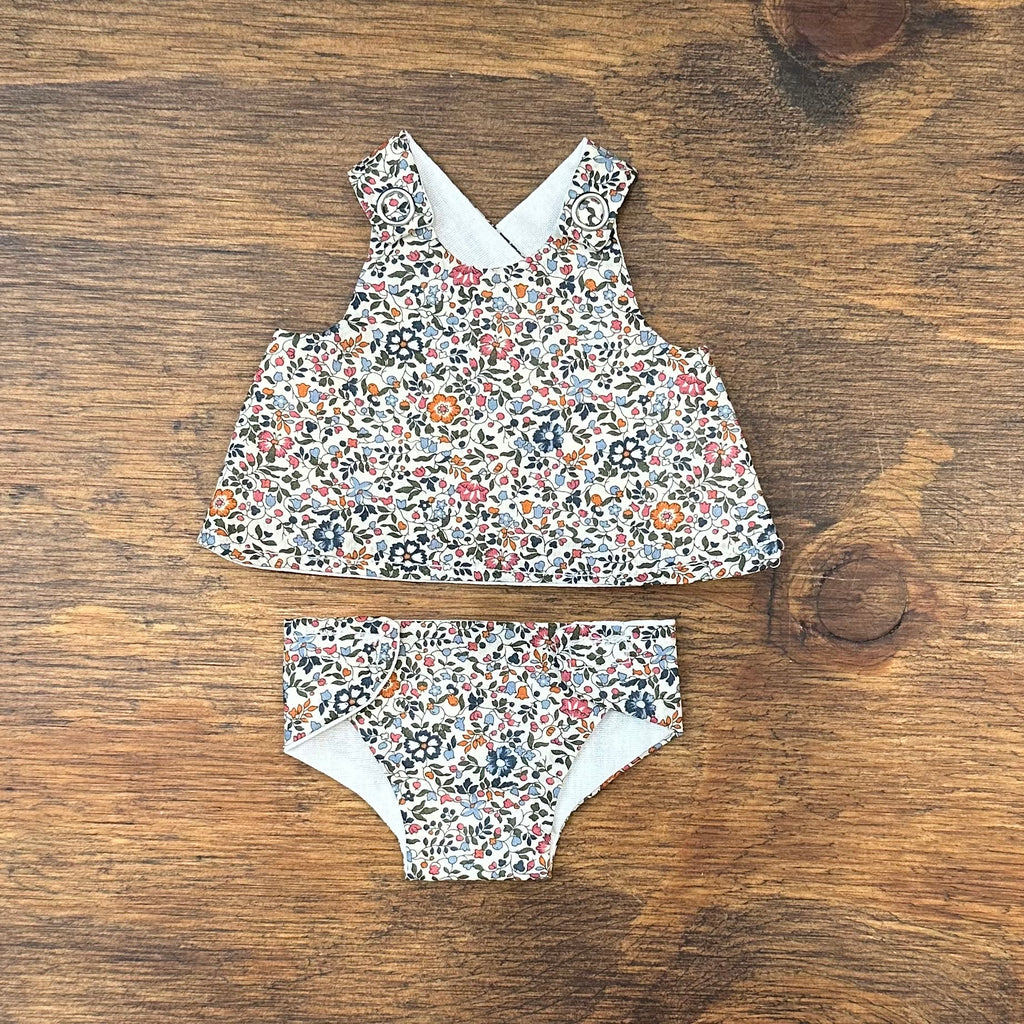 This lovely little two piece is hand made by Hayley Jane from Victoria, Australia. This 21cm set comes with a top and a matching nappy. The nappy is fastened with velcro and the top with metal snaps. These two types of fasteners aid the development of fine motor skills. The dress is fully lined with white cotton to help children to understand about clothes being in the right way. The two piece is made from Liberty of London fabric and lining, and is most suitable for Miniland 21cm Dolls but can fit other dolls of similar dimensions. Available in four different fabrics - Betsy Pink, Betsy Blue, Capel Mustard, Capel Pink and Katie and Millie fabrics.