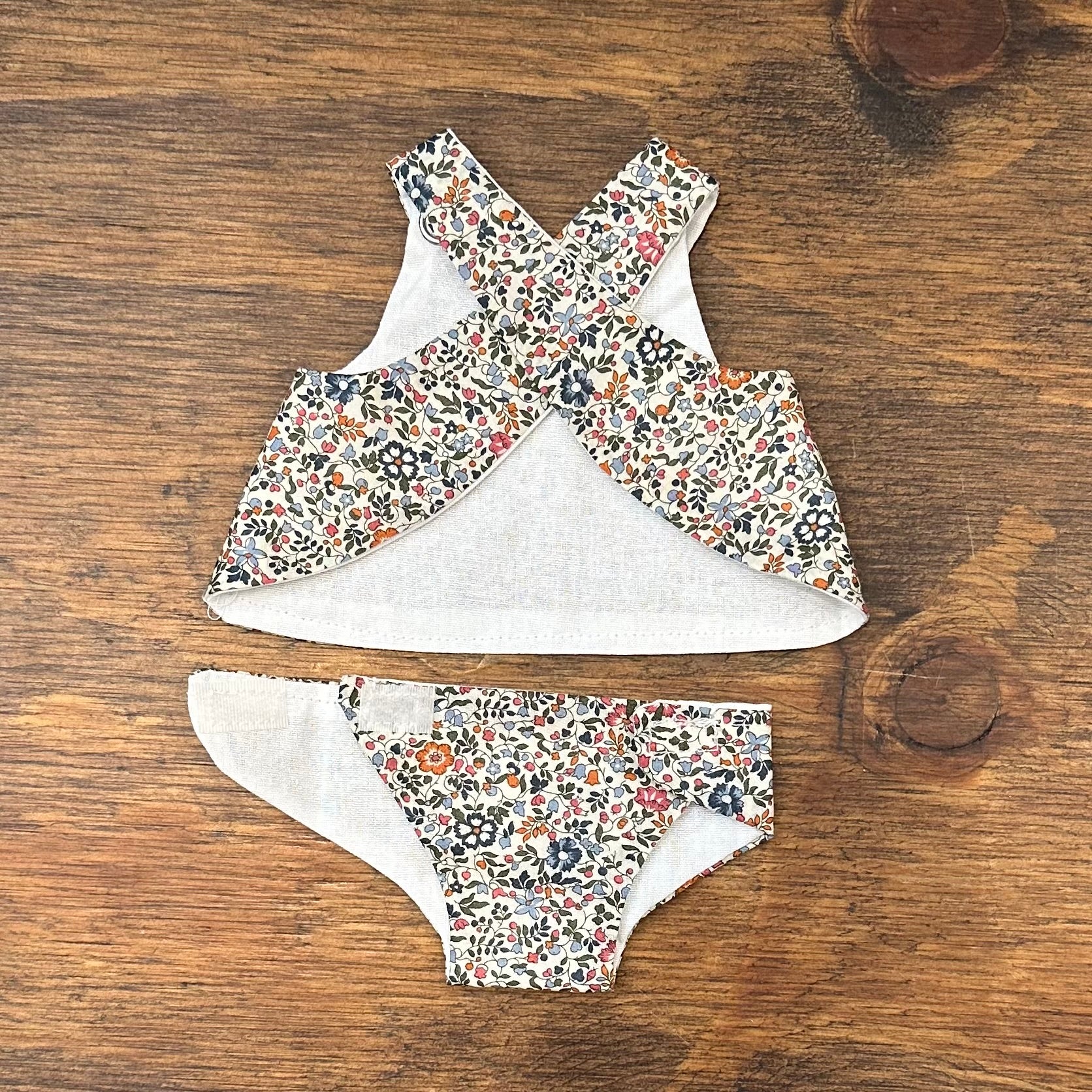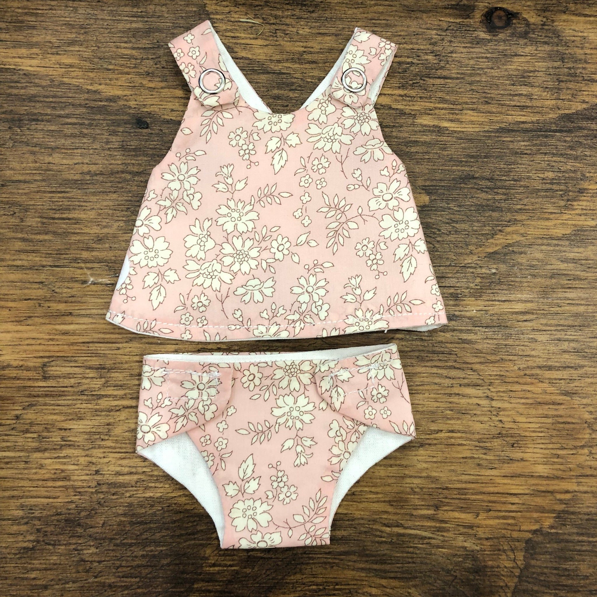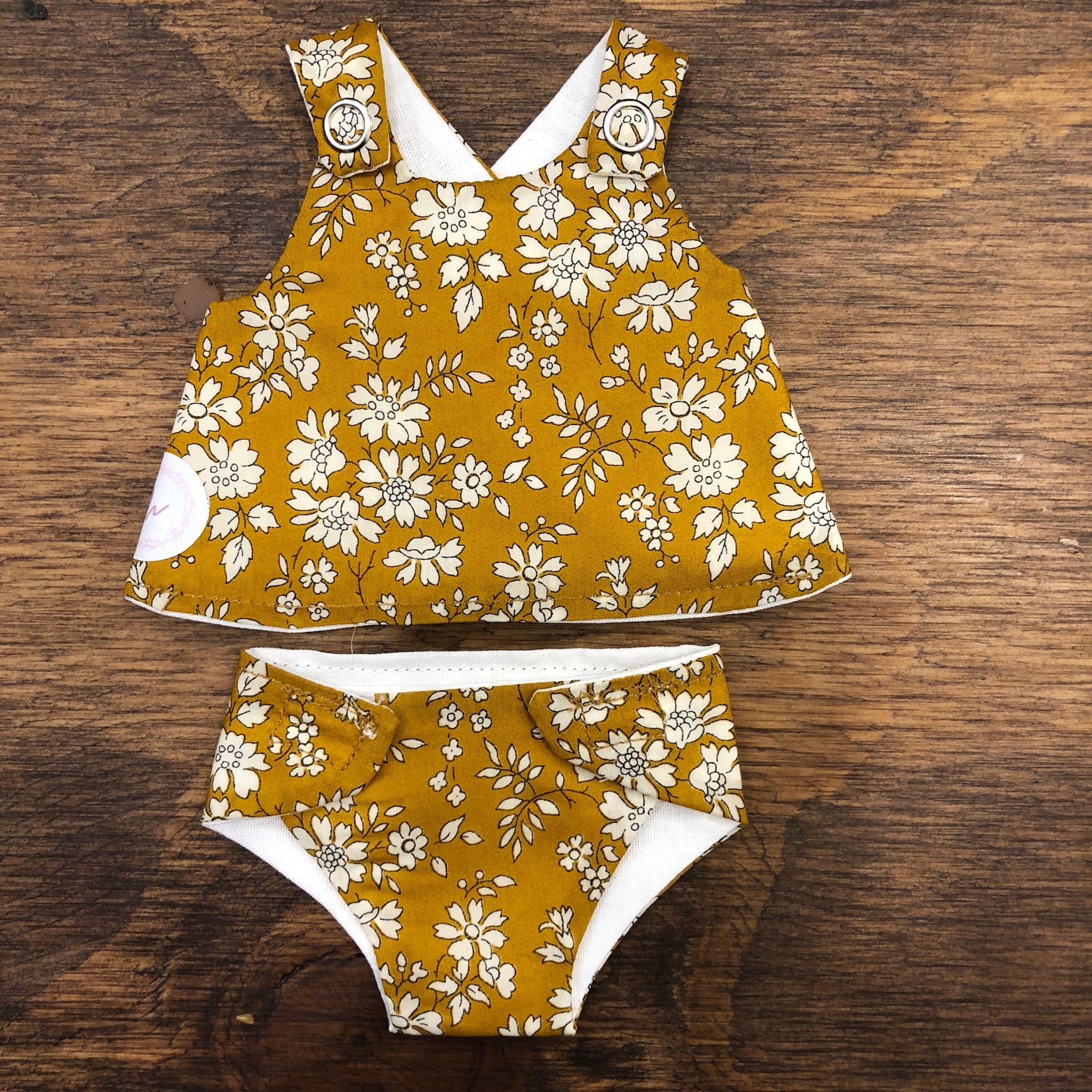 This lovely little two piece is hand made by Hayley Jane from Victoria, Australia. This 21cm set comes with a top and a matching nappy. The nappy is fastened with velcro and the top with metal snaps. These two types of fasteners aid the development of fine motor skills. The dress is fully lined with white cotton to help children to understand about clothes being in the right way. The two piece is made from Liberty of London fabric and lining, and is most suitable for Miniland 21cm Dolls but can fit other dolls of similar dimensions. Available in four different fabrics - Betsy Pink, Betsy Blue, Capel Mustard, Capel Pink and Katie and Millie fabrics.