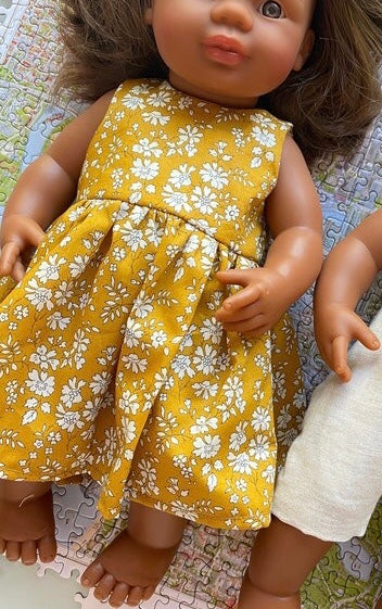 The prettiest little dress is hand made by Hayley Jane from Victoria, Australia. This 38cm dress has a lined bodice and easy for little hands to dress dolly. The dress is made from Liberty of London fabric and lining, and is most suitable for Miniland 38cm Dolls but can fits other dolls of similar dimensions. Available in Capel Pink and Capel Mustard fabric.