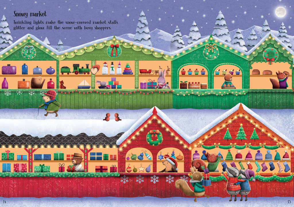 From a snowy Christmas market to Santa's gleaming sleigh, sprinkle magic over the festive scenes as you add the sparkly stickers. Help Squirrel, Bear, Penguin and friends decorate the scenes with over 200 stickers of adorable animals, Christmas presents and decorations.
