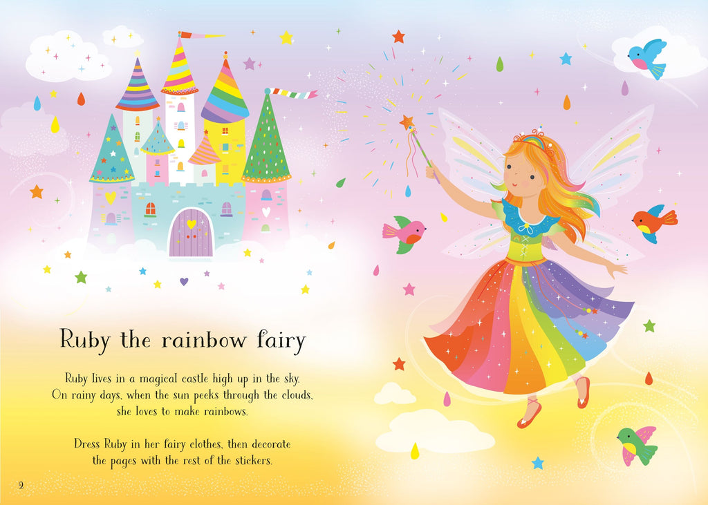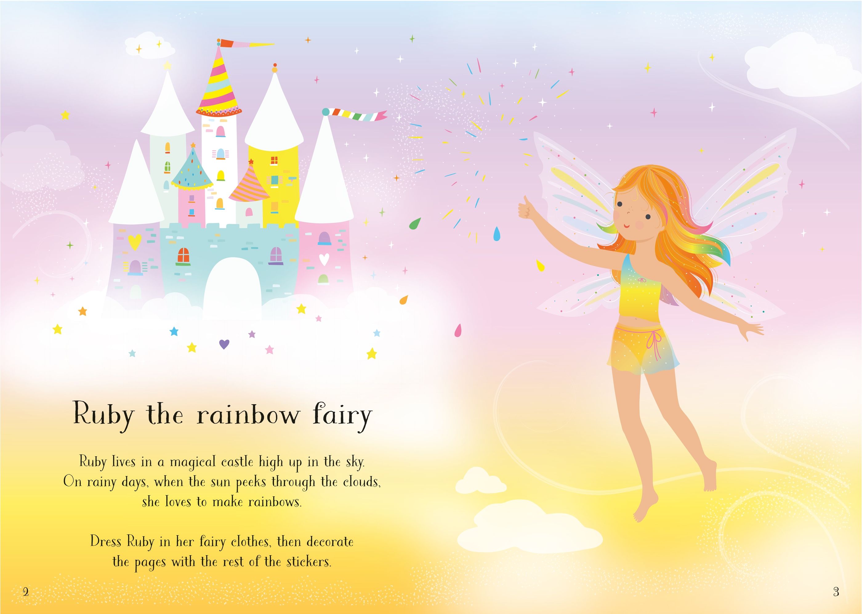 Follow Ruby the Rainbow Fairy as she flutters around Fairyland in this enchanting sticker book. There are lots of magical scenes to decorate, from an orange grove and yellow meadow to painting rainbows in the sky. With over 200 stickers of outfits, animals and flowers to dress the dolls and decorate the pages.