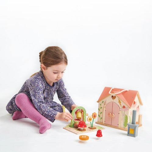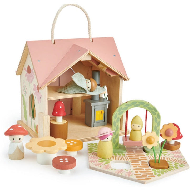 A magical wooden all in one doll's house that can be packed up and carried away on any adventure. The adorable set features:
