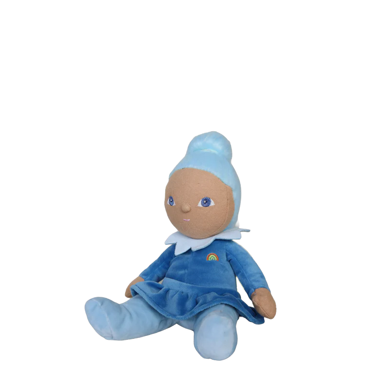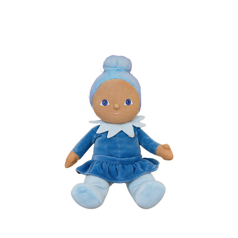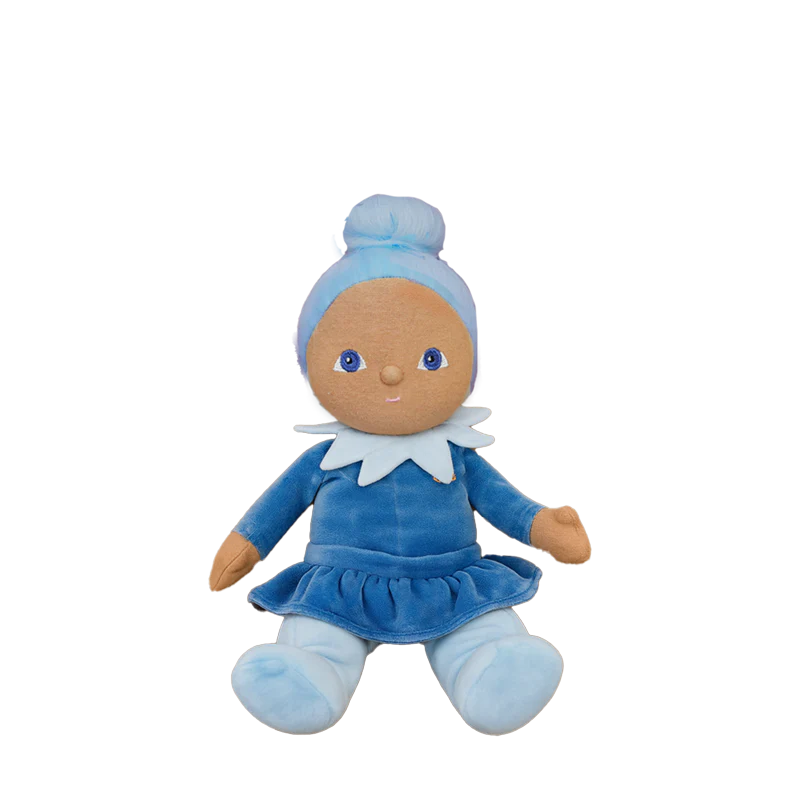 Iris is a breeze in her blue twirly dress - bright-eyed, ready to play, and always close by. Whether tucked into a tote, cradled at bedtime, or perched on a bookshelf, Iris brings a calm joy wherever she goes.