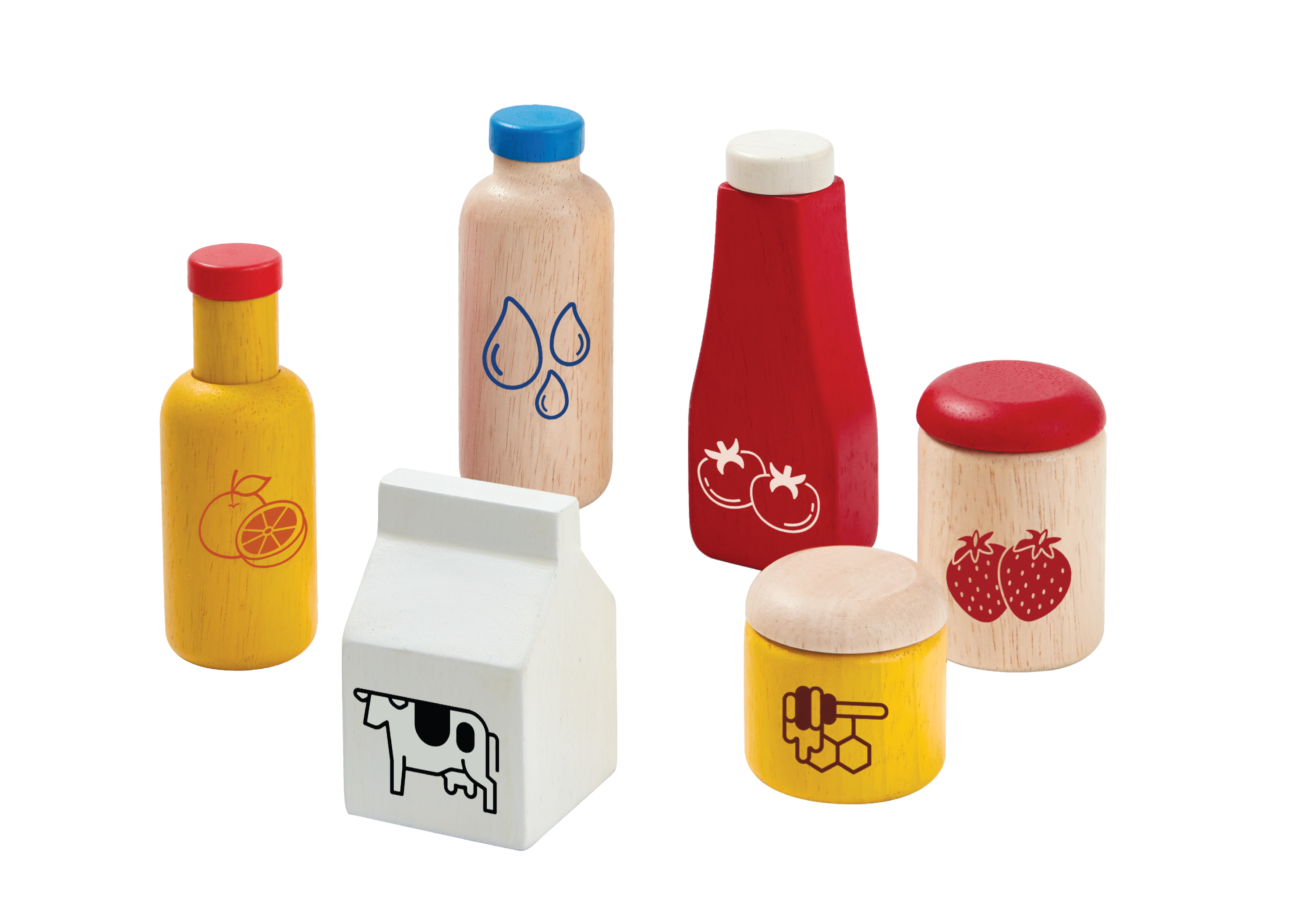 Role play as a little chef or practice serving dinner to a group of guests! Children can let their imaginations run wild in the kitchen with a variety of beverages and condiments that help complete any form of kitchen play. This set pairs perfectly with other PlanToys kitchen and pretend-play items.