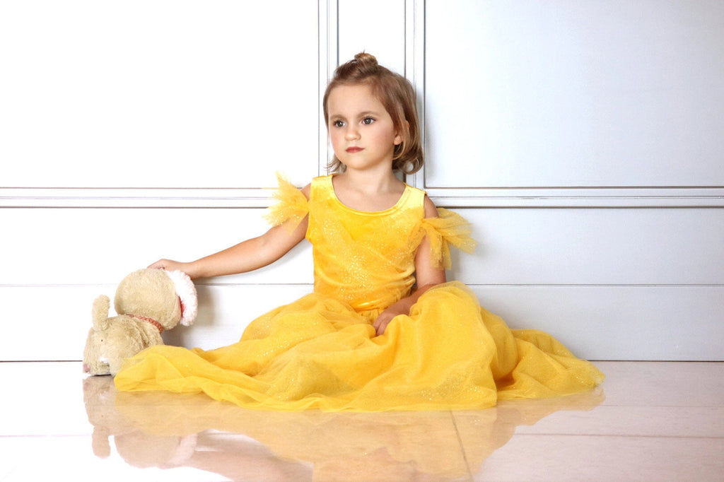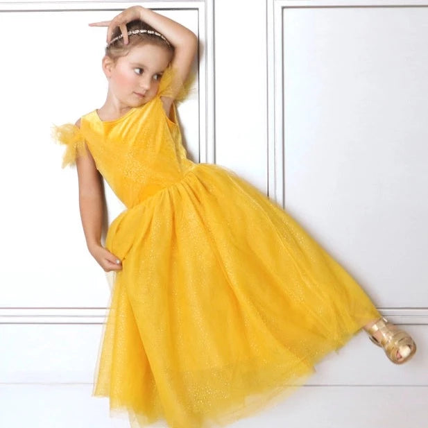 Transform your child into a sunshine filled Belle with our dreamy version of the Iconic yellow ballgown. Starting on top with a sleeveless super soft stretch velvet bodice, overlaid with crossing tulle details in the same golden tone. Off the shoulder tulle flutter sleeves and a full gathered skirt made from multiple layers of the same, shimmering tulle, making this a dress worth twirling for!