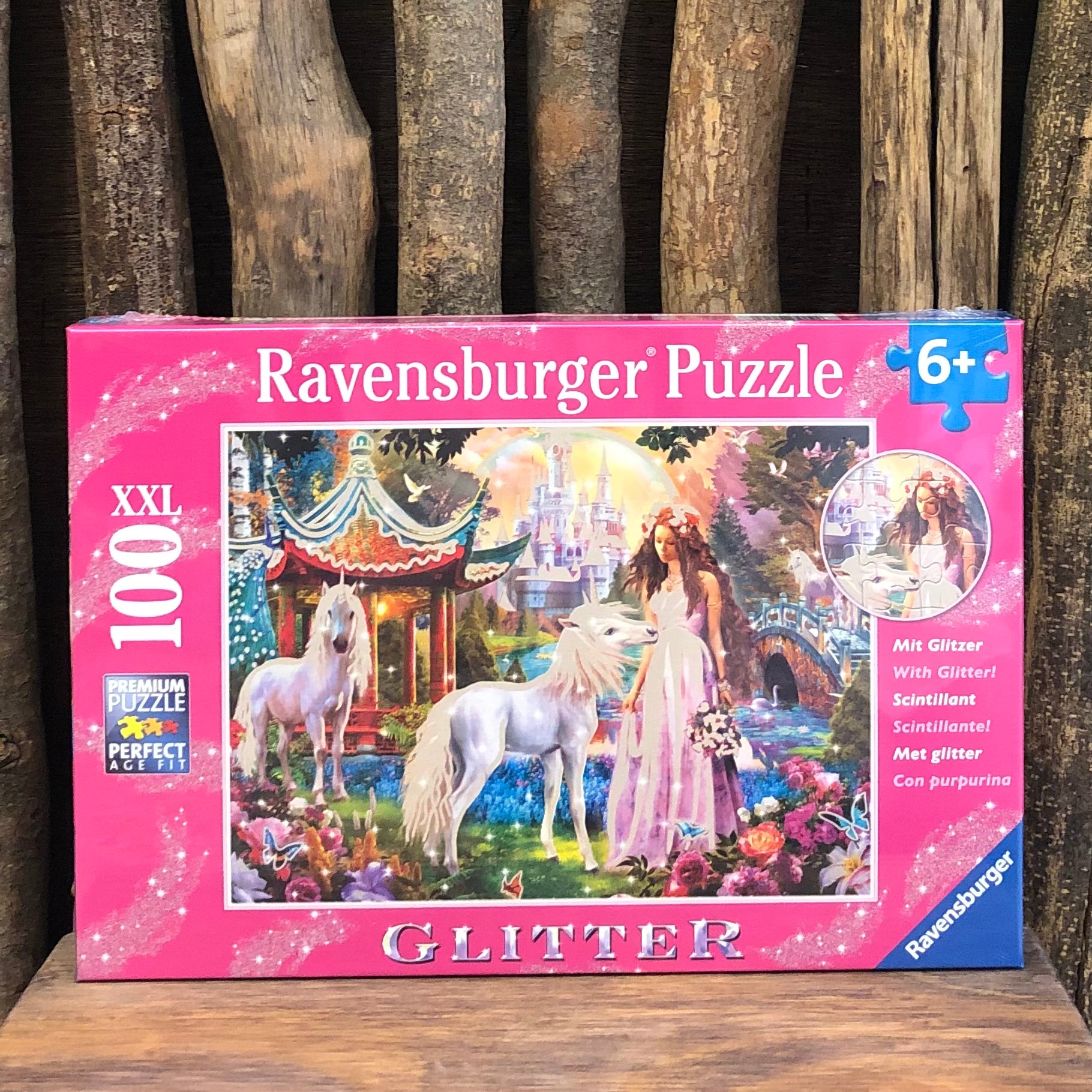 Beautiful fairies and brave knights inspire the imaginations of all little puzzlers. Hours of puzzling in far away fantasy lands. This 100 piece Princess with Unicorn Glitter Puzzle by Ravensburger is simply magical!