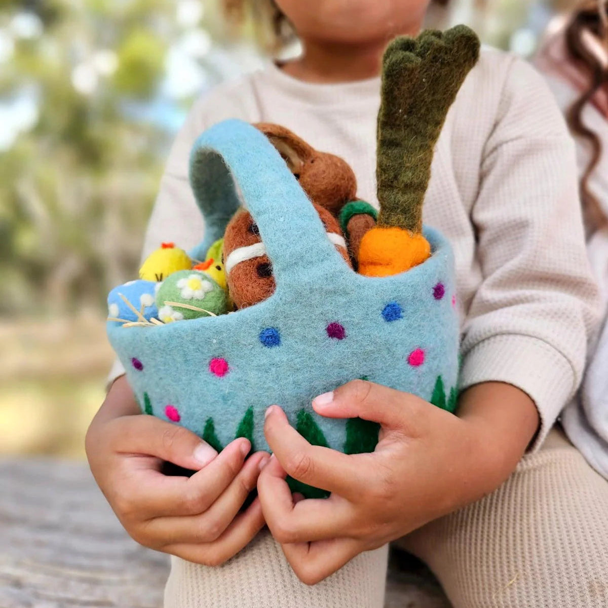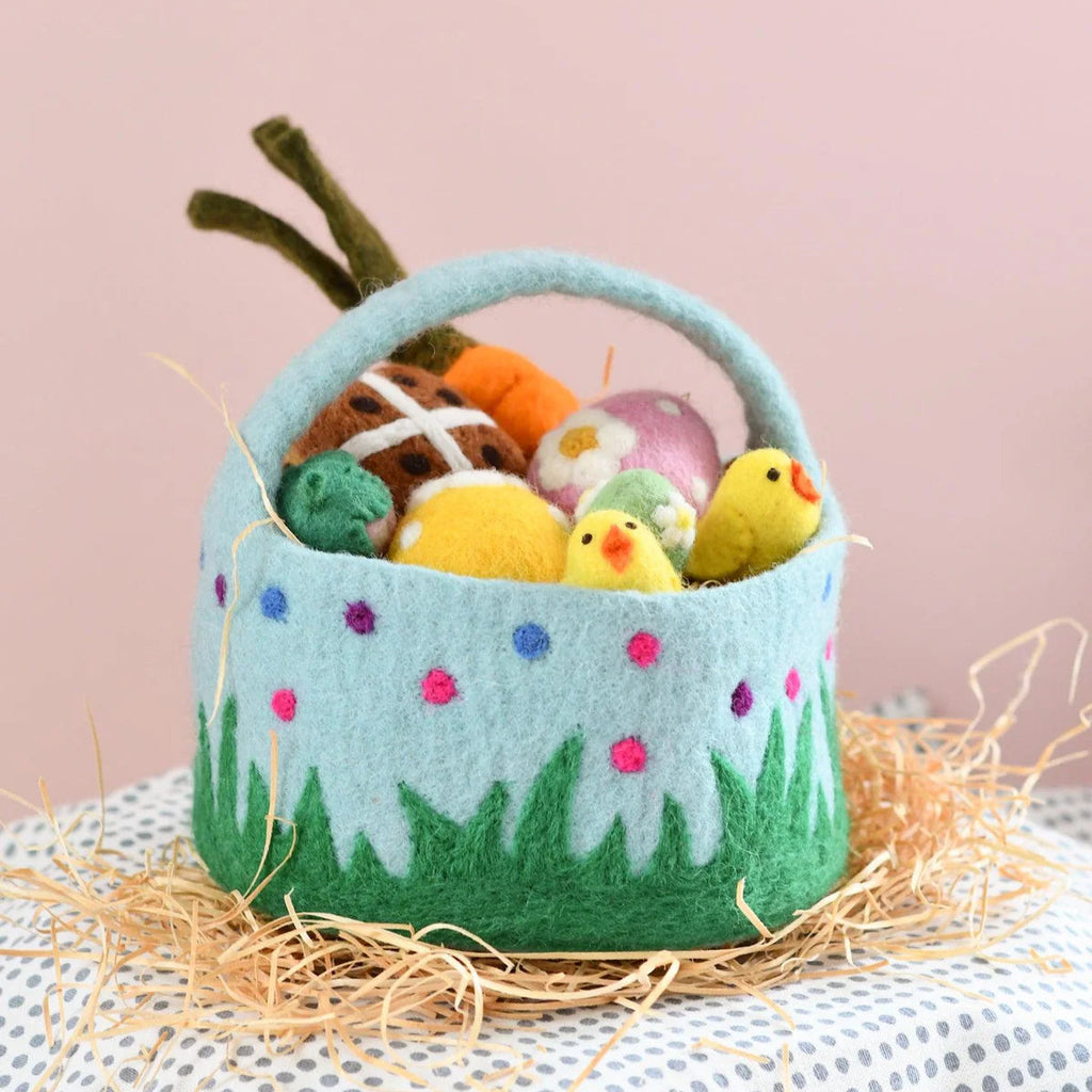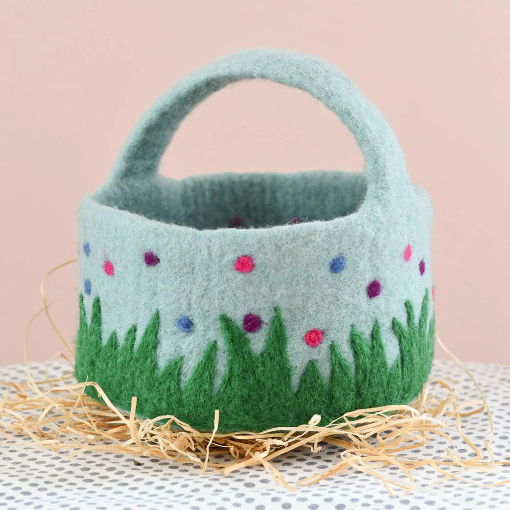 Make this Easter egg hunt extra special with our adorable felt blue basket adorned with colourful dots and wavy grass! Perfectly sized for little hands and brimming with charm, this basket is an essential accessory for your Easter festivities.