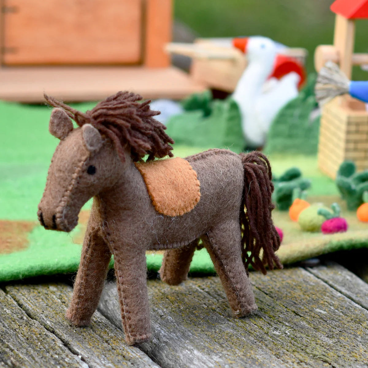 This felt horse is an excellent small world play toy, ideal for early childhood education and preschool settings. It helps develop fine motor skills, language development, and cognitive abilities through imaginative play.