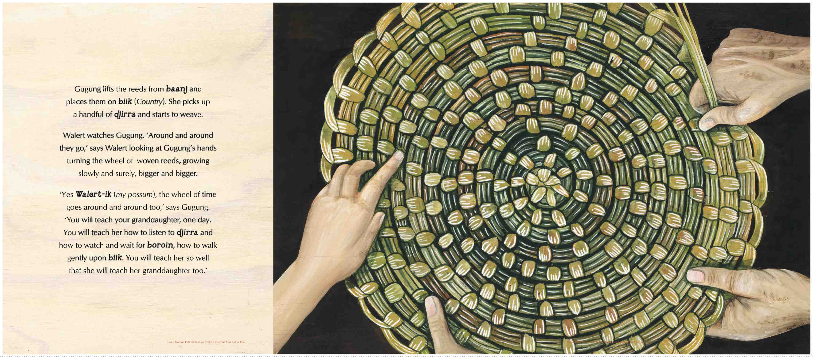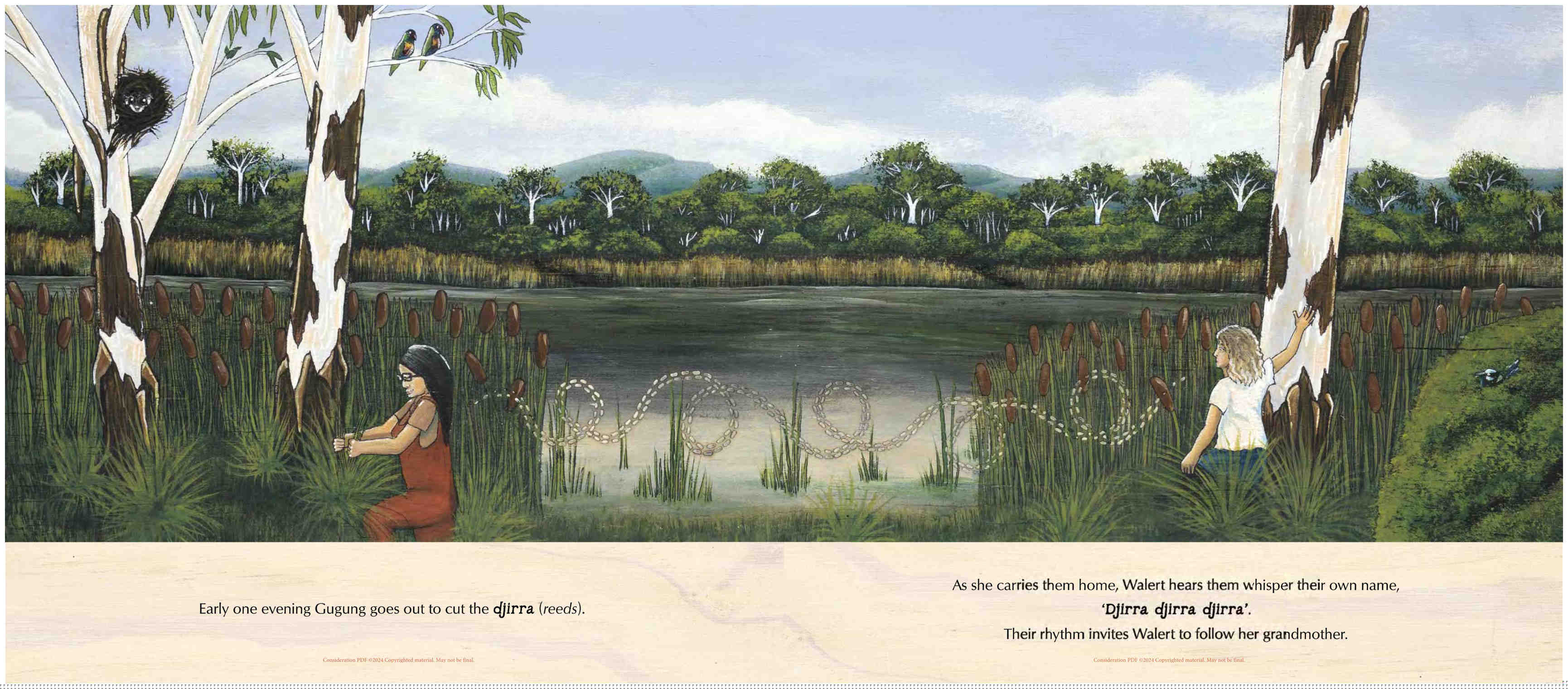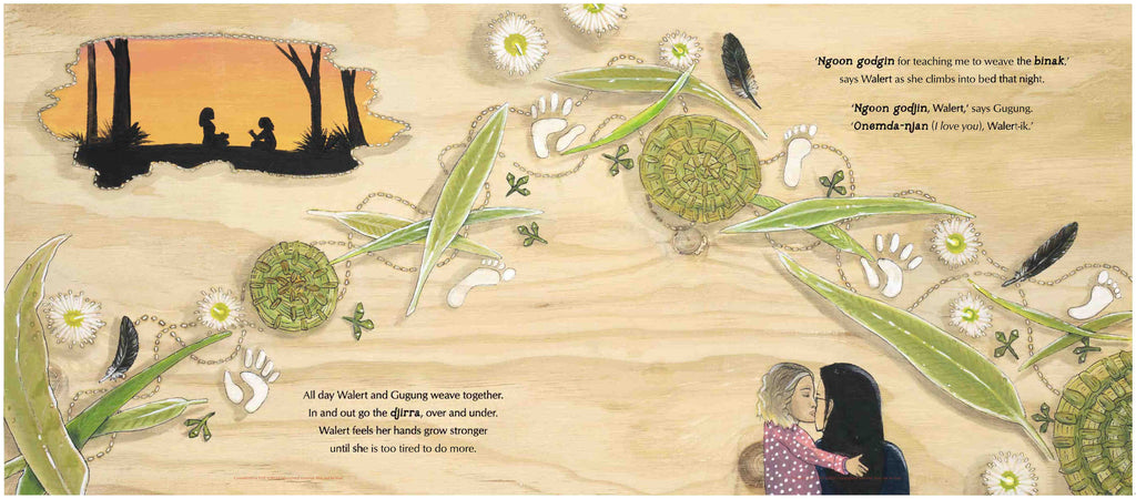 Walert's grandmother, Gugung, is collecting reeds (djirra) to weave a basket (binak) and finally, Walert is big enough to take part and learn this important cultural practice. But when a pair of blue wrens interrupt them, Walert realises that the birds have something to teach her, too.