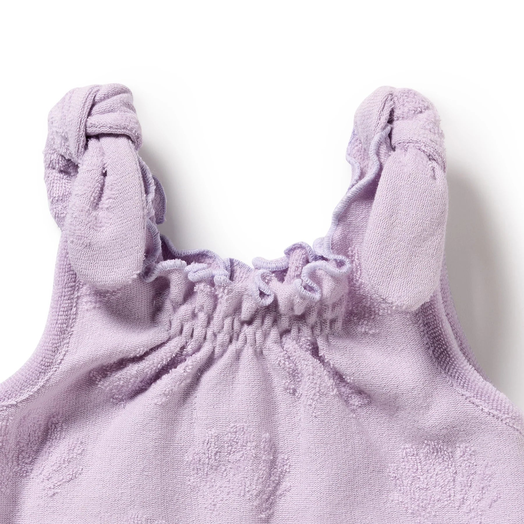 Made from GOTS-certified organic cotton terry towelling, this adorable playsuit is soft, absorbent and perfect for summer adventures. Featuring a fun all-over lavender shell jacquard pattern, it’s designed with fixed shoulder straps and sweet mock tie detailing. The shirred leg openings ensure a comfy fit, while snaps at the crotch make nappy changes a breeze. Crafted from plush terry fabric, it’s gentle on delicate skin and ideal for warm-weather play.