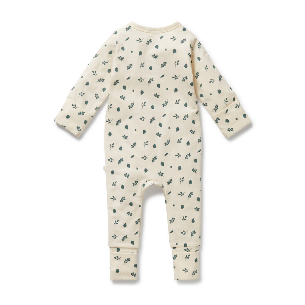 Key Features: Round neckline with concealed zipper for safety, long sleeved with fold over mittens (newborn to 000), full length with optional feet, two-way zip closure for easy changes, made from organic cotton, sustainably produced, wrapped in a bio-degradable bag.
